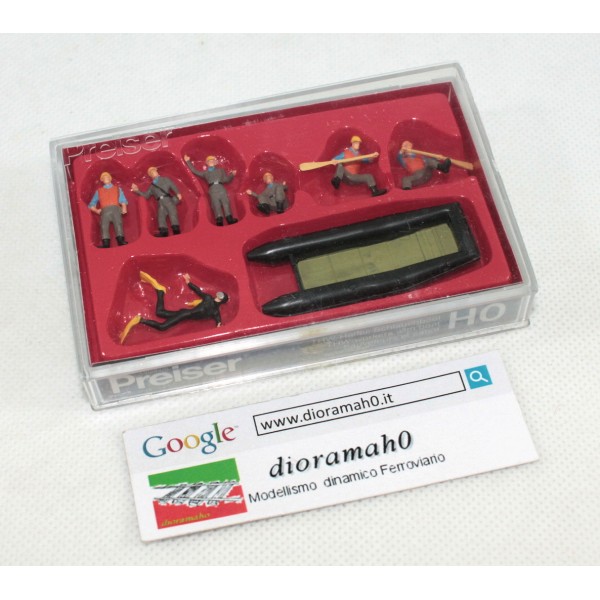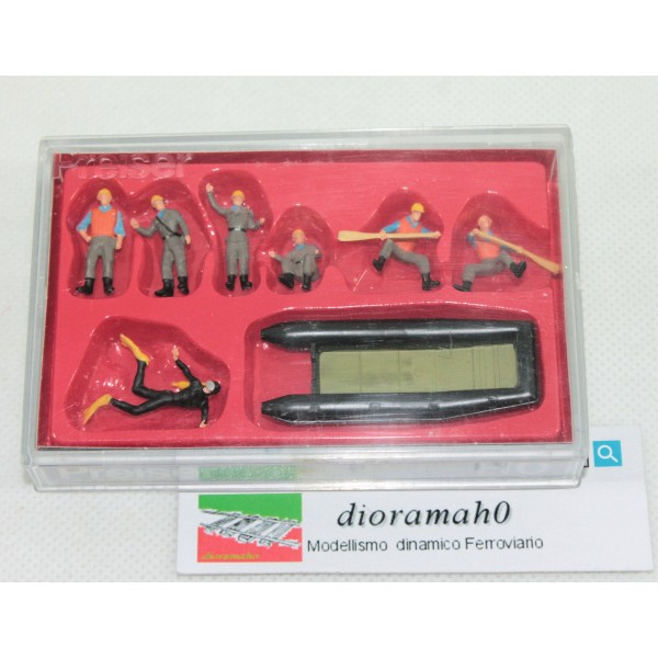 Squadra di soccorso per mari fiumi laghi.. in scala 1/87. La confezione come da foto è composta da 7 personaggi colorati e un gommone scafo. Tre i personaggi in piedi a riva che coordinano le operazioni, tre seduti nel gommone e un sommozzatore. Fondo di magazzino a un prezzo molto interessante.
