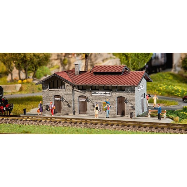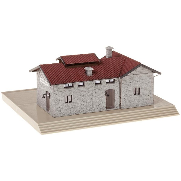 Stazione ferroviaria "Altoberndorf" stile come da foto in muratura rurale, ben fatta con annessa banchina, facile kit di montaggio con istruzioni, epoca III - scala 1/87. Dimensione: 188 x 155 x 87 mm.