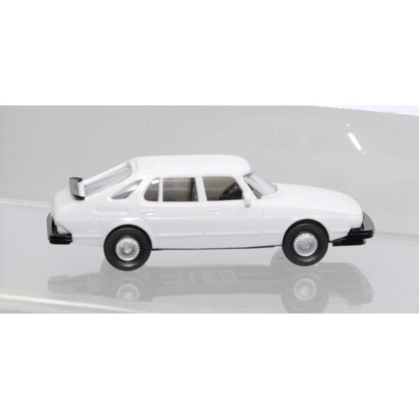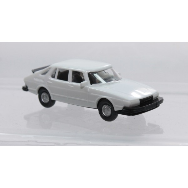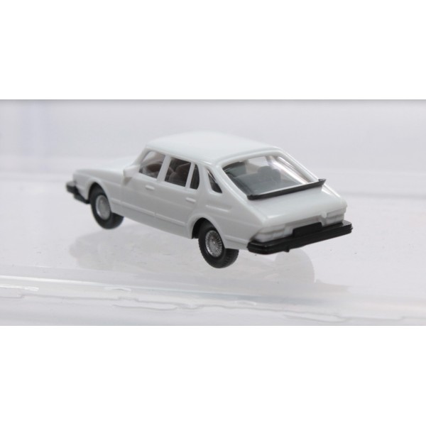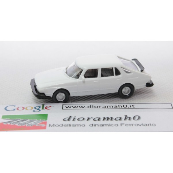 Saab 900 Turbo dal colore bianco, auto degli anni 80, fedelmente riprodotta in scala 1/87 per le scenografie dei plastici ferroviari.