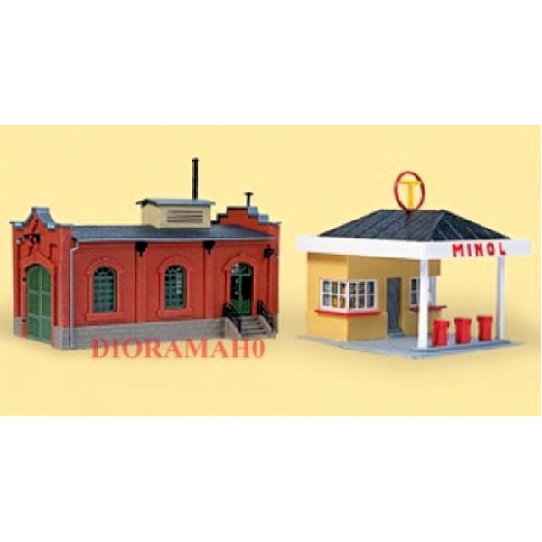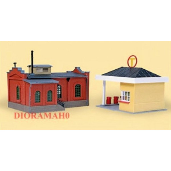 Kit da montare, pompa di benzina con garage/officina in pvc lucido colorato, all’interno della scatola si trovano le illustrazioni per il corretto montaggio. EPOCA II - III - IV . Arricchisci in tuo plastico ferroviario con numerosi accessori; fiori, alberi, autovetture, personaggi....