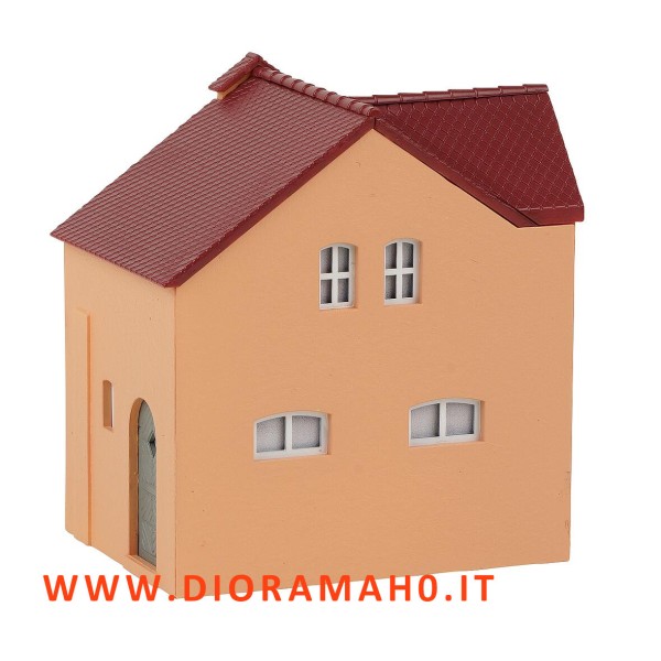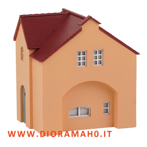 Lavatoio pubblico in kit di montaggio semplice, edificio a due piani con facciata intonacata e come da foto con annesso lavatoio, epoca II di facile inserimento nelle borgate rurali. Scala 1/87. Dimensione: 65 x 46 x 71 mm.