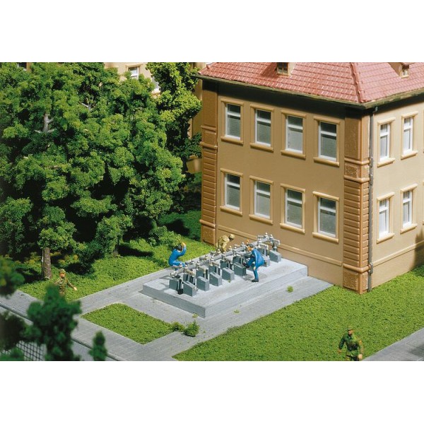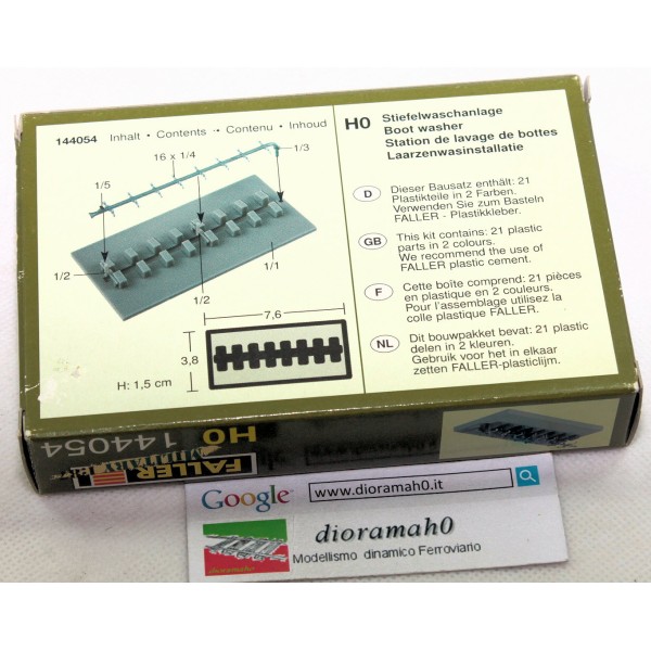 Stazione lava stivali militari, dopo la marcia la pulizia! Come da foto impianto di lavaggio stivali multiplo per le caserme e centri di addestramento militare. Scala 1/87, semplice kit di montaggio schema come da foto retro scatola, bi colore.