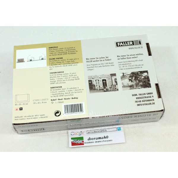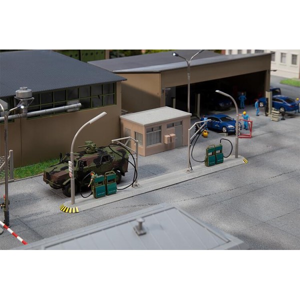 Stazione di servizio-rifornimento mezzi militari, con edificio di sorveglianza a parte come da foto, in kit di montaggio. Dimensione: edificio 80 x 50 x 35 mm. e pensilina 199 x 20 x 74 mm. Scala: 1/87