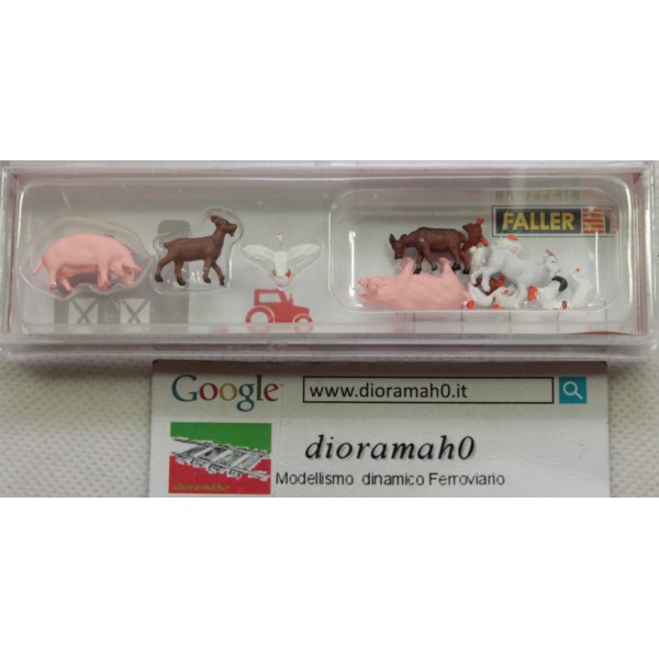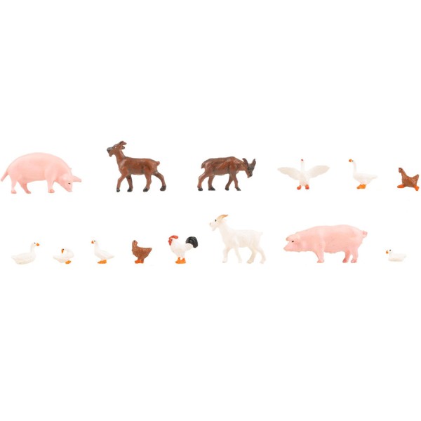 Set di bestiame pensato per arredare la fattoria, composto da: capre, maiali, polli e oche in ben 14 figure come da foto, alcuni in coppia. Scala 1/87.
