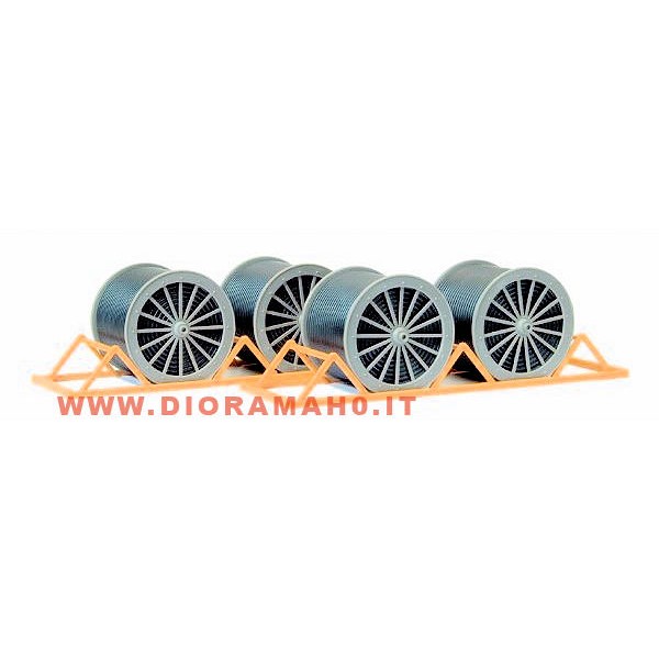 Bobine con supporto per il carico su carri merci, come da foto doppia coppia in un facile kit di montaggio e si realizza le bobine utilizzate per i cavi elettrici e si costruisce anche i suoi suppurti per il trasporto su veicoli e carri merci a sponde basse, carri di qualsiasi marca.