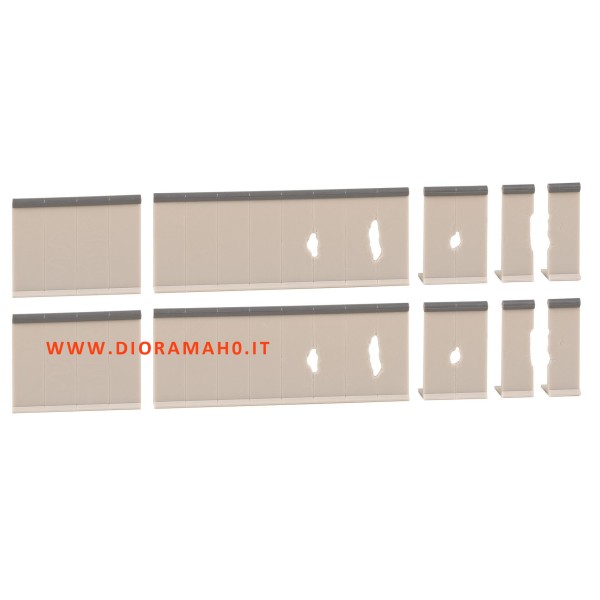 Muro di cemento-divisorio per molteplici situazioni, molto bello l' effetto buco che rende vissuto il muro in cemento, dimensioni; 220 x 24 x 43 mm scala 1/87, epoca III. SI suggerisce poi un po' di pigmenti puri per l' effetto invecchiamento-sporcatura.