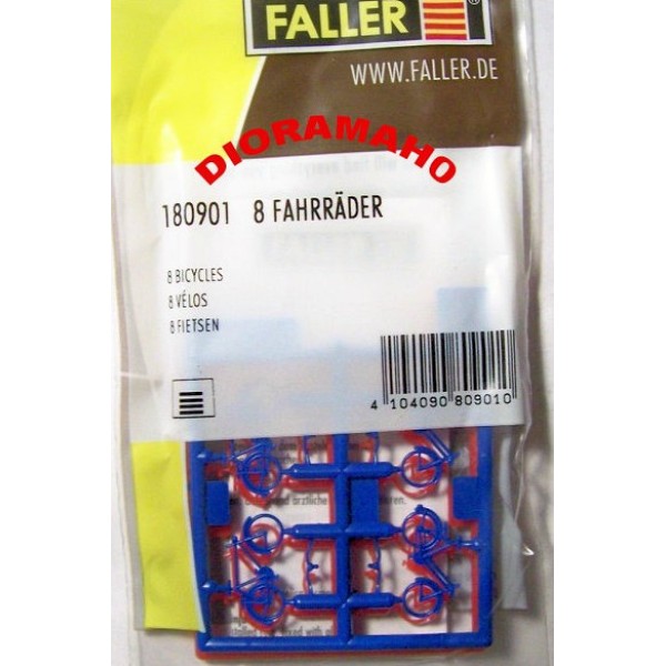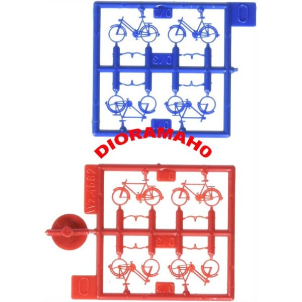 Set composto come da foto da otto biciclette in due colorazioni, rosse e blu, suddivise come potete notare per uomo e donna, posto una foto con delle bici nel porta biciclette che si può realizzare tranquillamente con un pezzo di eulithe da 4 mm.