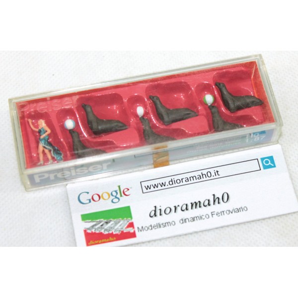 Foche e personaggio da circo come da foto, scala 1/87. Sei foche di cui tre con la palla e tre senza con la propria educatrice.
