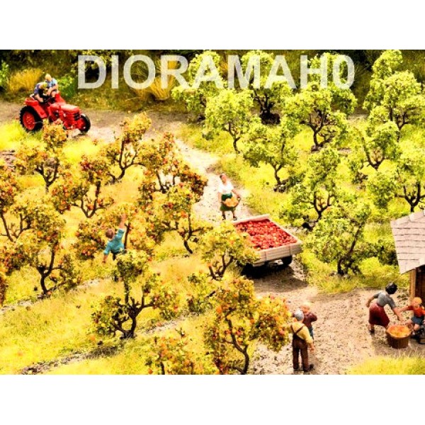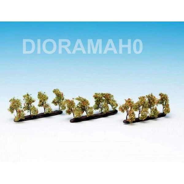 Piantagione alberi da frutto, composto da 12 piante di melo suddivise in tre filari, come da foto- 4 alberelli per fila con rilievo di terra, usare colla per il fissaggio. Altezza 3,5 cm per plastici ferroviari in scala H0 e TT. Confezione blister.