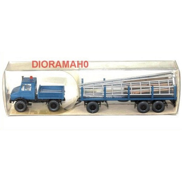 Unimog U1700 con rimorchio a tre assi, colore come da foto. Nel rimorchio merce che viene trasportata. Tutto in perfetta scala H0 per accessoriare al meglio il plastico ferroviario,