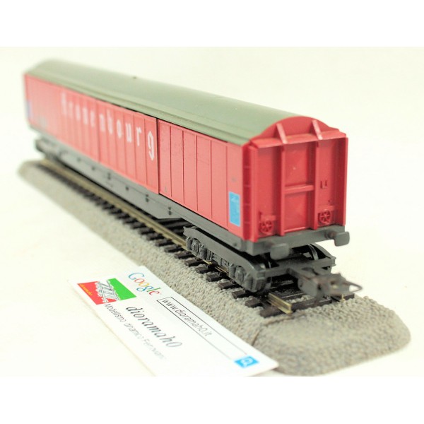 Carro merci chiuso con logo "Konenbourg" le porte sono scorrevoli in entrambi i lati come da foto, scala 1/87. Ganci e respingenti presenti. NO box originale. Usato.