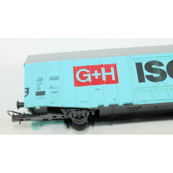 Carro speciale a due assi ribassati con loghi perfetti ISOVER G+H, livrea azzurro come da foto, scala 1/87. Usato e funzionante, nessuna mancanza. Box presente come da foto.