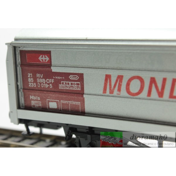 Carro chiuso con porte scorrevoli a due assi con logo MONDO FERROVIARIO rivista italiana specializzata nel settore, usato come da foto confezione originale. Usato e funzionante in scala 1/87