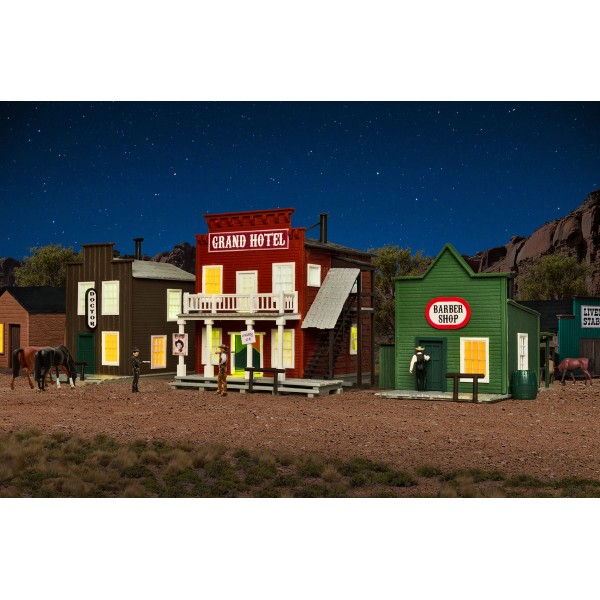 Set edifici far west: Grand hotel barbiere dottore e accessori come da foto in scala 1/87. Kit di montaggio con istruzioni, utilizzare colla per modellismo.