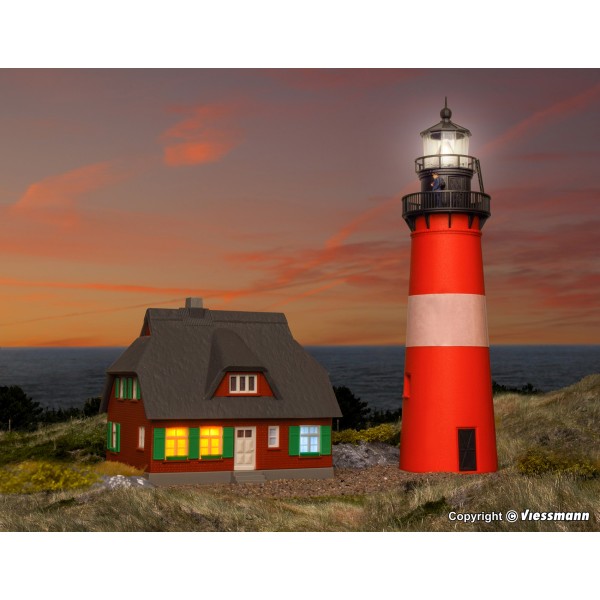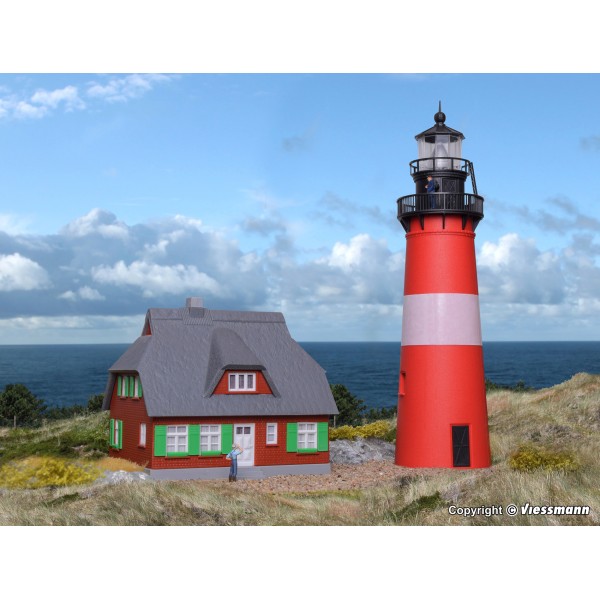 Faro rosso moderno con fascia bianca, torretta e faro nero, adiacente casa custode. Scala 1/87. Kit di montaggio facile.