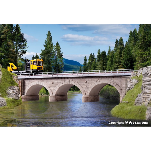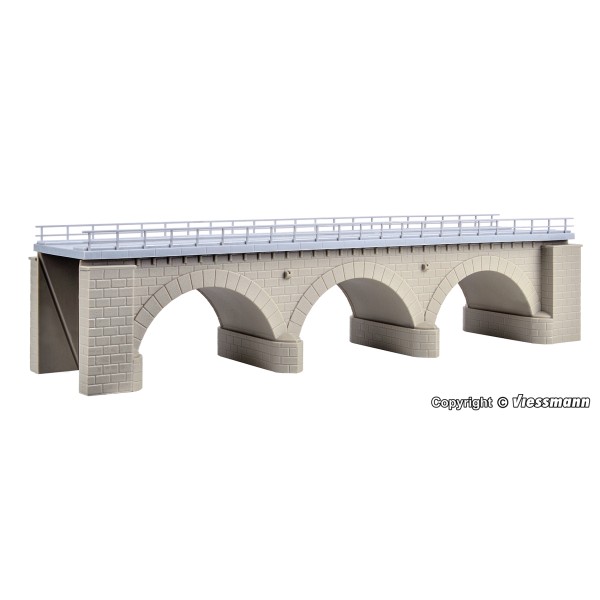 Ponte ferroviario in mattoni con tre archi stile romano, per un solo binario. Molto ben rifinito e curato, adatto anche per binari Märklin serie "C" . --kit di montaggio.-- Facile da montare, si consiglia l'invecchiamento del viadotto per dar maggior effetto al vostro diorama/plastico ferroviario. Nei viadotti KIBRI  è possibile installare l'art. 39754 Kibri - Supporto per fissaggio palo catenaria