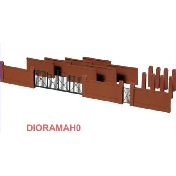 Cancello e muro di recinzione per ville o fabbriche, ottimo elemento scenografico riproduzione fedele in scala H0 1/87. Nella scatola trovi: 10 muri 56X30 mm - 14 pilastri 6X6X36 mm - 1 cancello 87X35 mm - 1 cancelletto 13X25 mm.