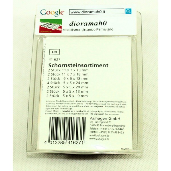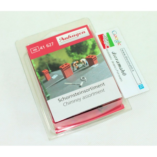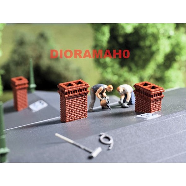 8 coppie di camini per edifici in scala H0 1/87 tutti diversi tra loro, stile italiano/europeo. Molto belli (vedi foto) assortimento di canne fumarie in mattone rosso, elemento scenografico da installare a piacimento nell'edificio auto costruito, oppure arricchire altri edifici già in tuo possesso. Totale 16 camini suddivisi in coppie con varie altezze e grandezze. Si incollano con la colla per pvc. Suggeriamo sempre di usare i pigmenti puri per un effetto sporca tura.