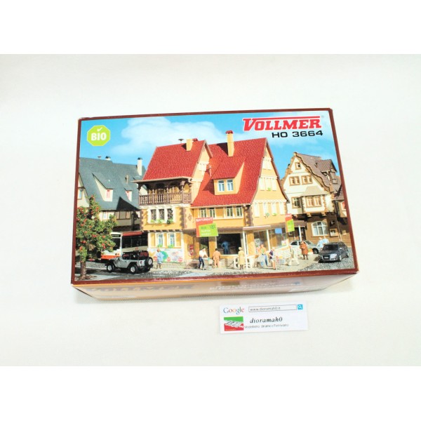 Supermercato BIO NATURA con appartamenti al piano superiore, ottimo da collocare nei centri urbani, molto colorato, kit di montaggio con istruzioni nella confezione, scala 1/87. Dimensioni: 168 x 140 x 145 mm.