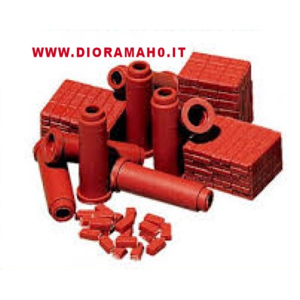 Laterizi non ché mattoni camini.. scenografia per plastici ferroviari in scala H0 1:87. Kit da montare con colla per pvc, nella confezione trovi le illustrazioni per la corretta costruzione. Da riporre nei carri merci, depositi ferroviari, nella fase di costruzione di un muro ..... Colore rosso mattone in pvc, consiglio sempre un po' di invecchiamento per eliminare l'effetto lucido!!