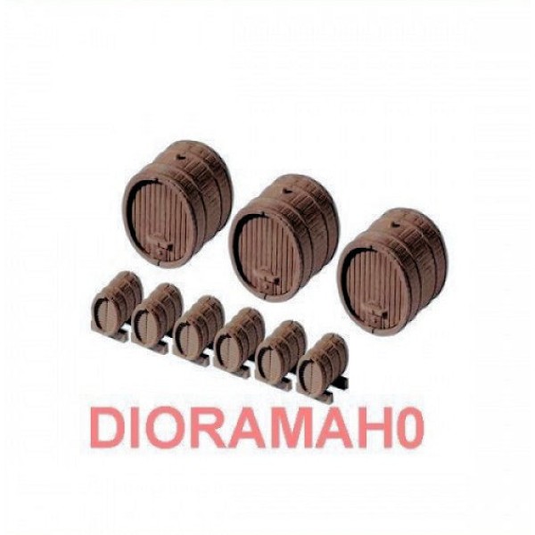 Set di botti di vino in legno con supporti, 9 pezzi totali, così composti: tre botti grandi e sei medie, scenografia per plastici ferroviari in scala H0 1:87 Da riporre nei carri merci scoperti, depositi vinicoli e ferroviari, aziende e fattorie vinicole.... Colore marrone (vedi foto), materiale pvc, consiglio sempre un po' di invecchiamento per eliminare l'effetto lucido!! kit da montare con colla per pvc.