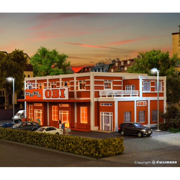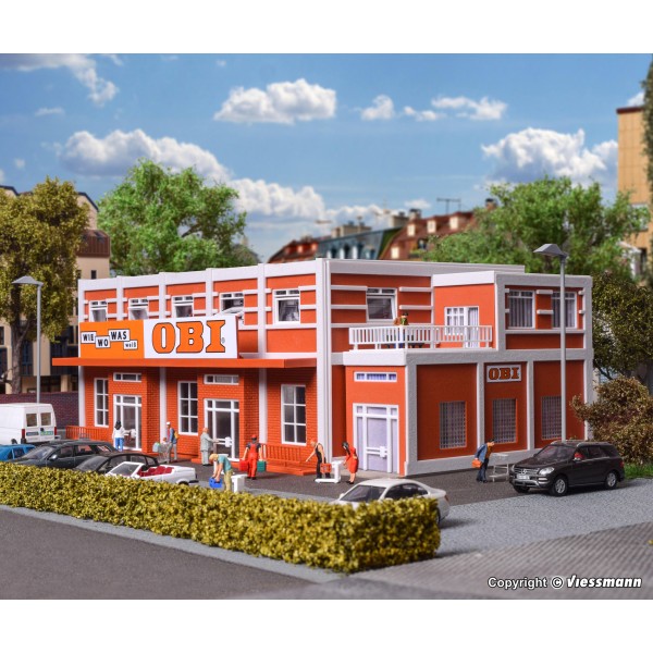 Ipermercato "OBI" negozio di hobbistica fai da te, riproduzione originale in miniatura scala H0 1:87, edificio in kit di montaggio per gli appassionati di ferromodellismo, materiale pvc colorato, da inserire nelle città in periferia e vicino ai centri commerciali, plastici ferroviari con diorami realistici!