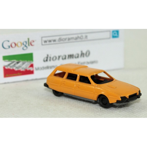 Citroen CX Break degli anni 1975, un' auto famigliare più lunga e comoda per i passeggeri di quei tempi. Riproduzione fedele in miniatura, materiale pvc colorato di giallo (vedi foto), usato e funzionante, elemento scenografico per plastici ferroviari in scala H0 1/87.