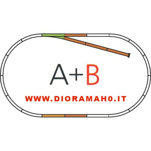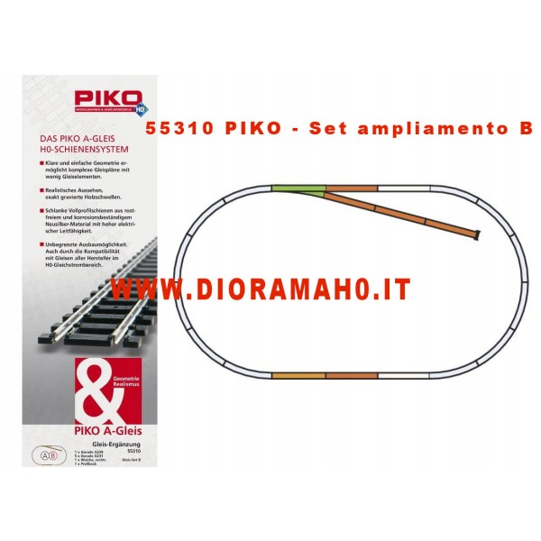 I set di binari Piko-A sono stati realizzati per permettere sia ai principianti sia ai modellisti esperti di utilizzarli in maniera veloce senza perder tempo. I semplici disegni dei tracciati binari PIKO-A ne permettono una continua espansione in modo graduale. Le confezioni contengono segmenti di binari che sono illustrati nei vari schemi, differenziati tra di loro da un sistema di codifica a colori. Gli scambi contenuti nei set di binari e nelle varie confezioni iniziali possono essere elettrificati installando l'elettromagnete per scambi 55271 PK . 55310 PIKO - Set ampliamento B Set disponibile per ampliare il proprio tracciato nel plastico ferroviario. Contenuto: 1 X 55221 WR (scambio destro) , 1 X 55200 G239 (binario dritto 239 mm) , 5 X 55201 G231 (binario dritto 231 mm) 1X 55280 binario terminale. Ingombro: A+B 158 X 88 cm - (misura riportata, sono sempre arrotondate) Spazio minimo necessario per l'installazione: 168X98 cm. Vedi foto. (Le parti colorate del tracciato è l'ampliamento B).