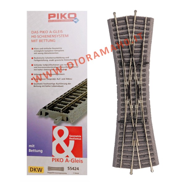 Doppio scambio inglese con massicciata (DKW), lungo 239 mm - raggio 15°. Confezione con un solo Pezzo, tutti i binari PIKO sono realizzati con un profilo alto mm. 2,50: sagoma fine e più realistica dei binari codice 100: il binario PIKO è compatibile con i rotabili di vecchia generazione, grazie alla rotaia “sottile”. Tutti gli scambi Piko con massicciata sono elettrificabili con l' articolo 55271 PK.