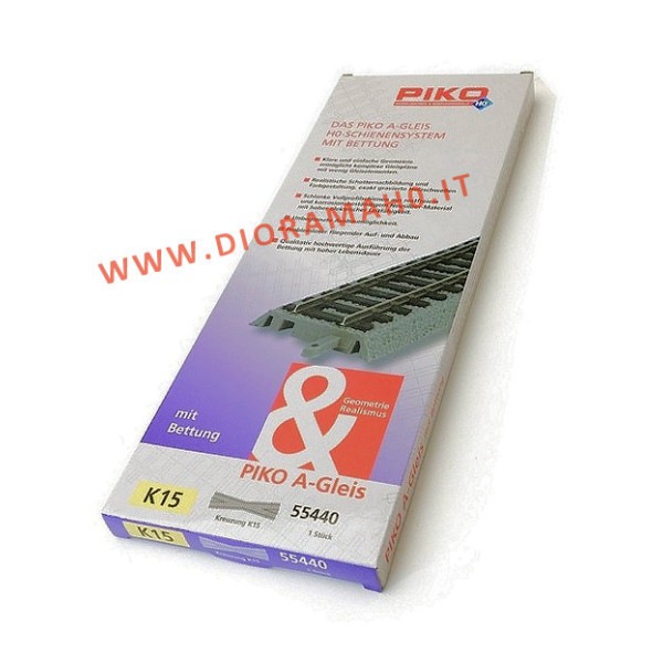 Incrocio K15, angolo 15°. Lunghezza come binario diritto = G239. Confezione con un solo Pezzo, tutti i binari PIKO sono realizzati con un profilo alto mm. 2,50: sagoma fine e più realistica dei binari codice 100: il binario PIKO è compatibile con i rotabili di vecchia generazione, grazie alla rotaia “sottile”. Tutti gli scambi Piko con massicciata sono elettrificabili con l' articolo 55271 PK.