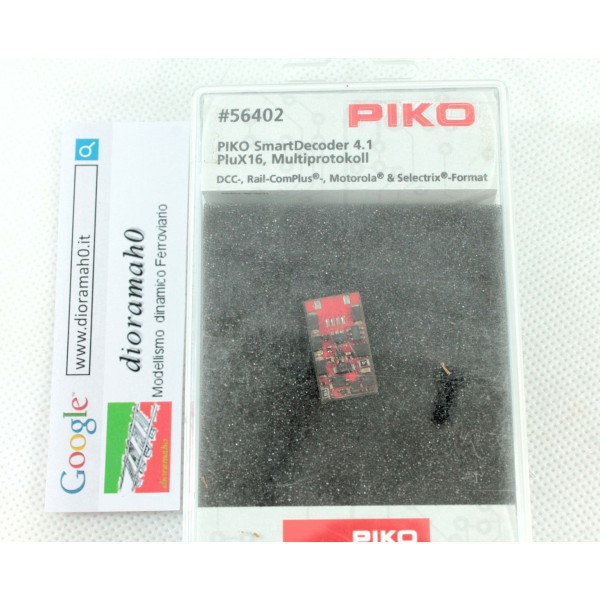 Il PIKO SmartDecoder 4.1 PluX16 è un decoder digitale universale di ultima generazione con diverse uscite luminose e un controllo motore 1,2A. Il PIKO Smartdecoder 4.1 controlla i formati dati DCC con Rail-ComPlus ®, Motorola ® e Selectrix ® e può essere utilizzato anche su impianti analogici. Lo Smartdecoder rileva automaticamente la modalità di funzionamento. È possibile richiamare fino a 44 funzioni aggiuntive commutabili.