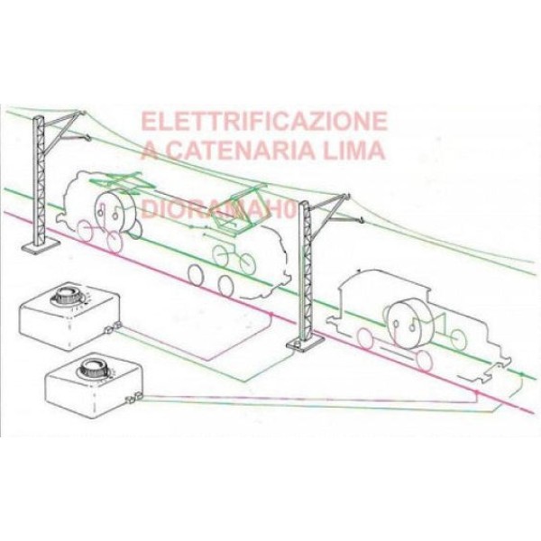 Come avviene nella realtà, le locomotive elettriche in miniatura possono ricevere la corrente di alimentazione dal filo aereo a catenaria che si sviluppa, sostenuto da appositi pali, lungo l'intero circuito dei binari; un polo della corrente passa da 1 filo al motore della locomotiva attraverso il pantografo - che funge da contatto strisciante - mentre l'altro polo percorre una delle due rotaie e giunge al motore attraverso le ruote. Si consegue così non solo un effetto di estrema fedeltà alla ferrovia reale ma anche il vantaggio di poter far circolare sulla stessa linea (e indipendentemente una dall'altra) due locomotive, una che viene alimentata solo dal binario, l'altra che riceve corrente da una delle due rotaie e dalla linea aerea. Bisognerà ovviamente che le ruote di presa corrente delle due locomotive siano tutte poste sulla rotaia alimentata in comune dai due trasformatori; in tal caso il senso di marcia e la velocità delle due motrici potranno essere regolati in modo indipendente. Nelle illustrazioni figurano alcuni esempi di linea aerea a catenaria su tratti rettilinei, a doppio binario e in prossimità di scambi. Si noti come i pali siano disposti sempre dallo stesso lato del binario e come essi siano muniti di supporti alternati lunghi e corti, affinché - come nella realtà - la linea aerea segua un percorso a zig-zag. Ciò consente un migliore contatto fra il filo aereo e il pantografo ed evita che quest'ultimo si usuri in un solo punto Il sistema a catenaria LIMA, al pari del sistema di binari LIMA, è concepito in modo da assicurare la massima modularità e compatibilità al binario.