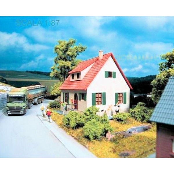 Kit da montare, casa/villino famigliare in pvc lucido colorato, all’interno della scatola si trovano le illustrazioni per il corretto montaggio. Pratico e bello edificio privato di facile collocazione nel plastico ferroviario!
