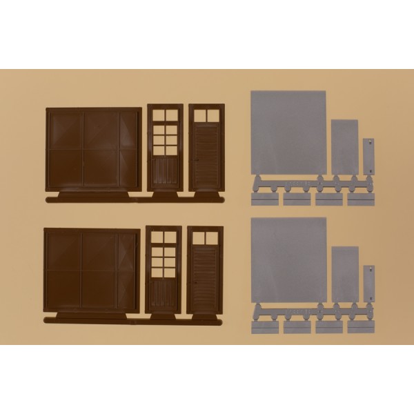 Portoni e porte marroni per realizzare edifici industriali artigianali la confezione comprende gradini per le porte colorazione grigia e rampe per la salita e discesa di muletti, trans pallet, carrelli e veicoli.... in perfetta scala 1/87.