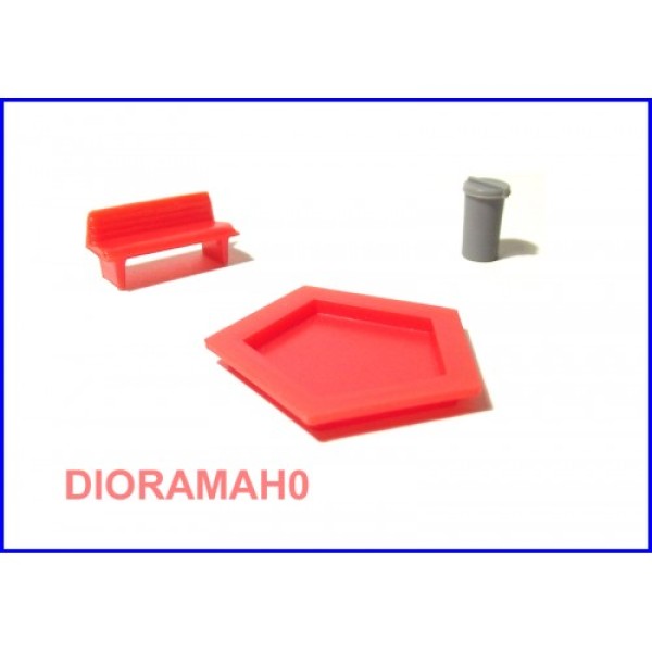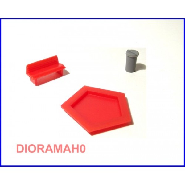 Accessori per parco giochi - scuole asili... Corredo di otti elementi composto da 4 sedie 1 panca 1 tavolo 1 bibone della spazzatura e uno spazio giochi (inserire a picimento sabbia) esagonale che tipicamente troviamo presso asili scuole materne nelle spiaggie.....abitazioni private... Colori come da foto.