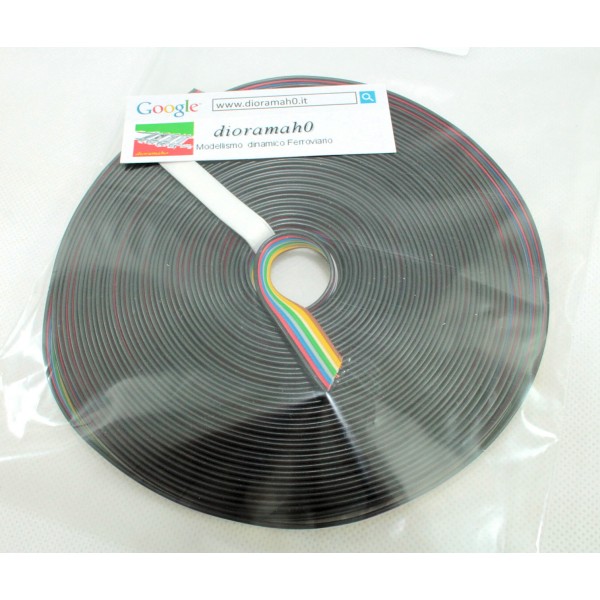 8 Cavi uniti tra loro "modello piattina" in diversi colori, per 10 metri. Colori: Marrone giallo, bianco, verde, grigio, blu, rosso, nero. (8x14x0,15) . -- Sezione 8 cavi X 0,25 mm² -- Ottimi per collegare da parte a parte a lunghe distanze; deviatori scambi illuminazioni, motori, servo comandi, segnali ferroviari, ecc.. avendo ordine e meno confusione sotto al vostro plastico ferroviario. Disponibile il formato 5 metri per plastici ferroviari piccoli e medi.