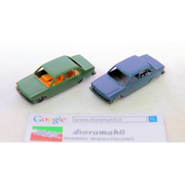 Coppia auto FIAT 131 come da foto, blu prima serie senza interni collocate solitamente nelle bisarche Lima, la seconda color verde di produzione più limitata. Usato in buone condizioni. Scala 1/87.