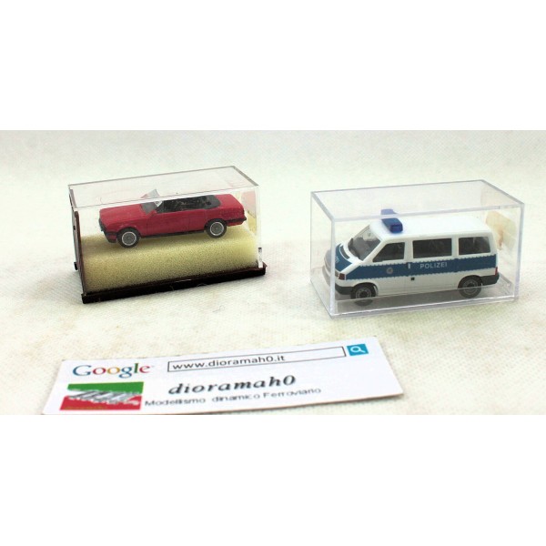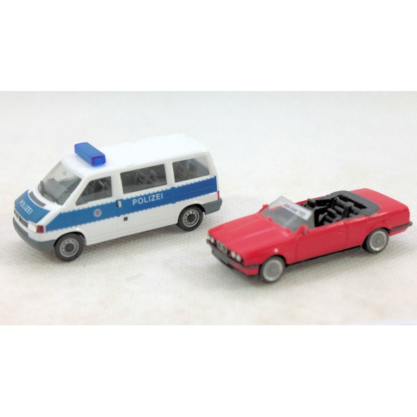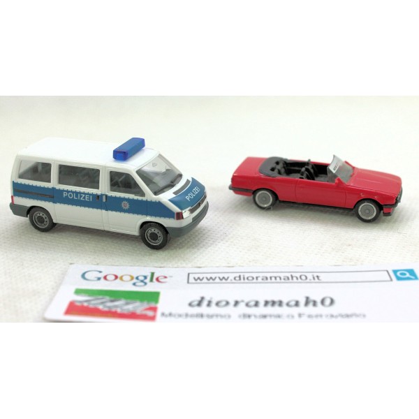 Coppia auto e furgone serie Herpa, scala 1/87. Auto modello di BMV Cabrio e VW Furgone della polizia usato in perfetto stato. Scatola non originale ma compatibile per modelli in scala 1/87 come da foto.