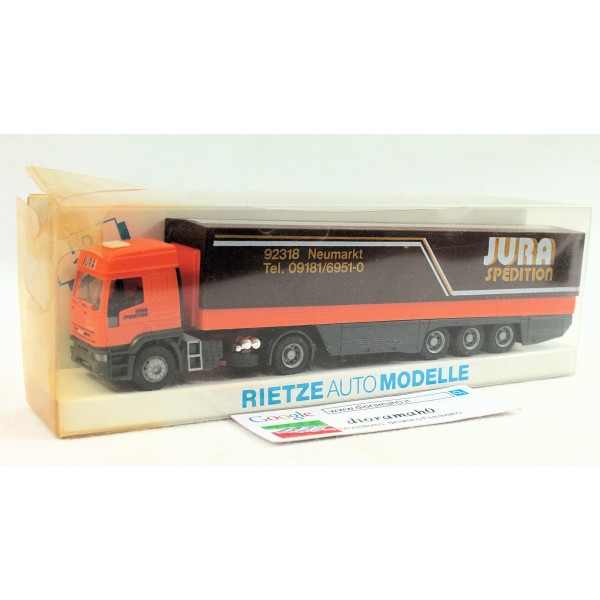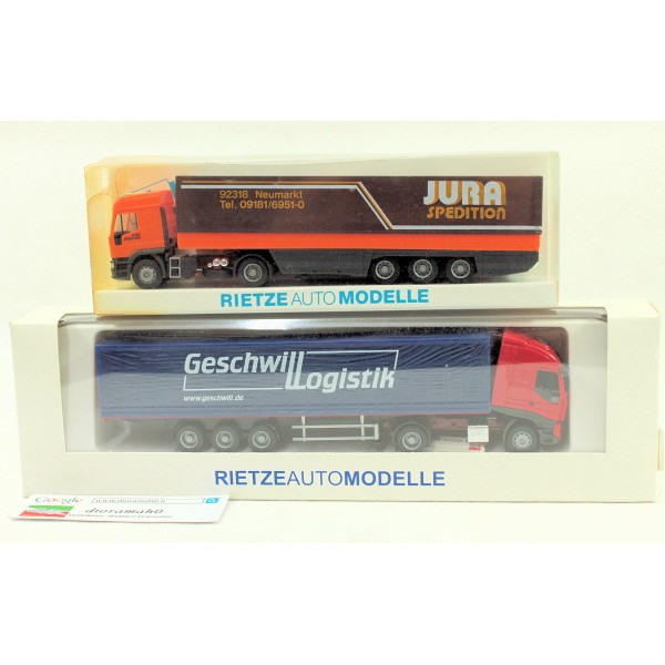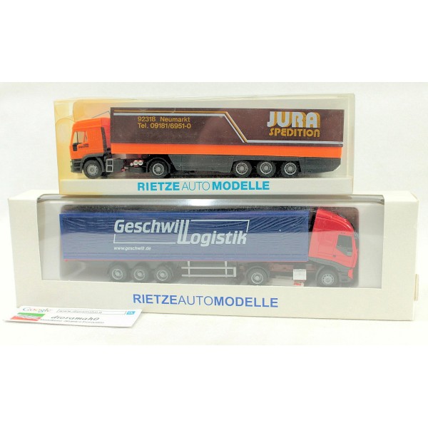 Coppia autoarticolati per trasporto merci, corriere.. modelli della RIETZE in scala 1/87. Si segnala la confezione (ultima foto) usurata, nulla pregiudica lo stato del modello.