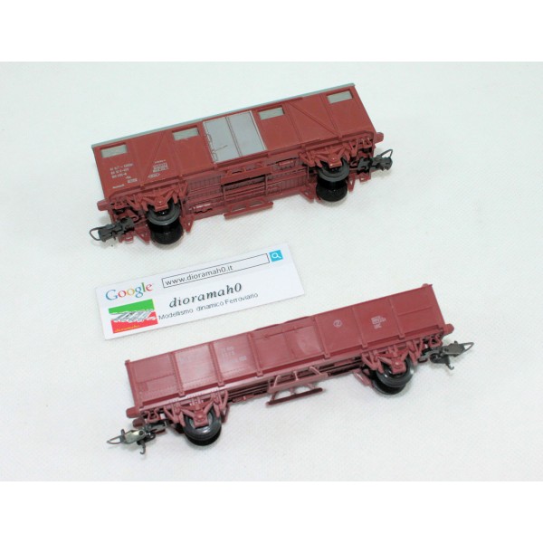 Coppia carri serie economi di LIMA. Carro aperto a sponde alte uno e chiuso, a due assi in plastica, usato e funzionante come da foto. Da star set, no box. Scala 1/87.