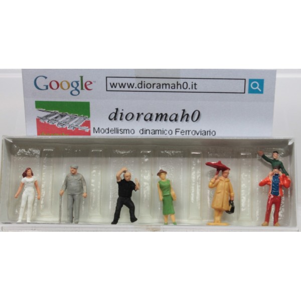Sei personaggi differenti per età e sesso, un muratore, viaggiatori, personaggi a passeggio, marca: NOCH PREISER. Scala 1/87.