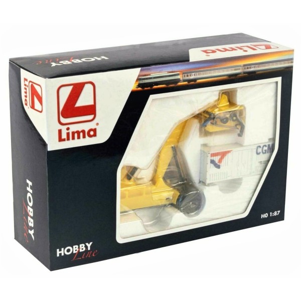 Carro elevatore color giallo, in dotazione anche un container CGM (20 FT). Il modello presenta ottime figure e dettagli come nella realtà ! Carro elevatore da posizionare sulle zone di carico - scarico di depositi doganali del vostro plastico ferroviario !