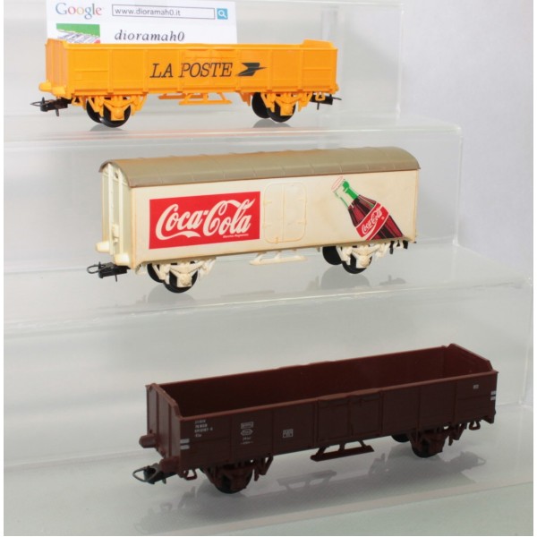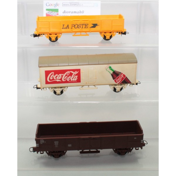 LIMA tre carri merci usati in scala 1/87, nessuna mancanza, due carri a sponde alte, uno chiuso della coca cola, carri funzionanti con assi in plastica a ganci tutti presenti.