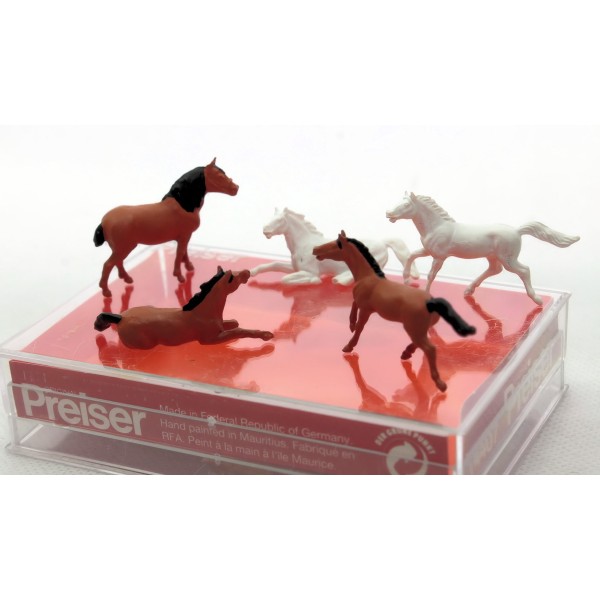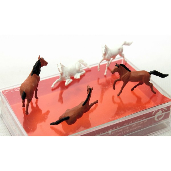 Set di cinque cavalli in due tonalità e diverse posizioni, ottimi per praterie, colline, fattorie, maneggi.. scala 1/87. Confezione sacchetto.