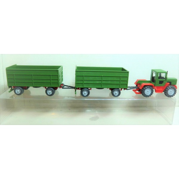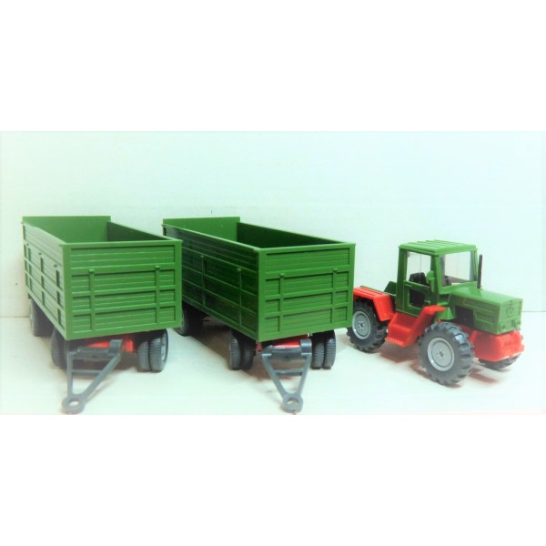 Trattore con due rimorchi a sponda alta, ottime per il raccolto di barbabietole e foraggi, in scala 1/87. Colori come da foto, scenografia per diorami ferroviari.