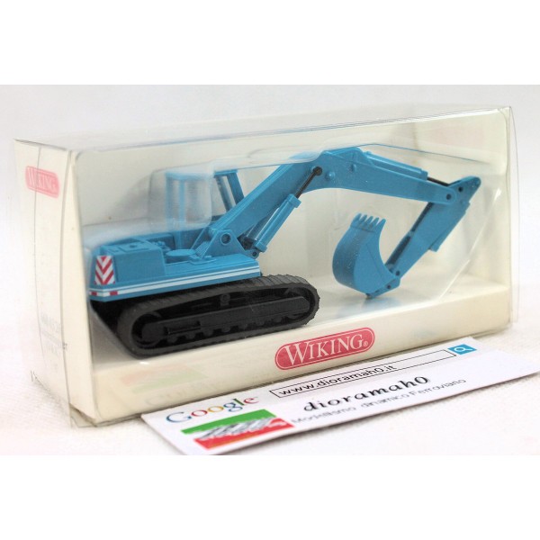 Escavatore cingolato come da foto blu (nel sito altri colori). La cabina è ruotabile e la benna è regolabile a piacimento. Scala: H0 1/87.
