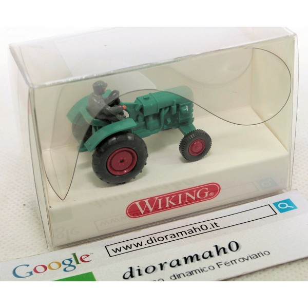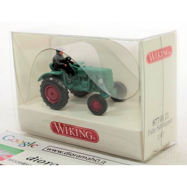 Trattore Fahr Schlepper con personaggio alla guida, colorazione verde classica, disponibile anche arancione, scala 1/87.