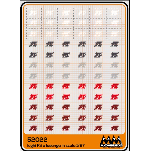 Decal simbolo FS (ferrovie italiane) losanga color nero per locomotive carrozze e carri merci. In uso dal 1982 agli anni 90'. Riproduzione fedele in scala H0 per il ferromodellismo. Per livree danneggiate o rovinate dal tempo, oppure ricostruzione e/o trasformazione di un tuo convoglio ferroviario!